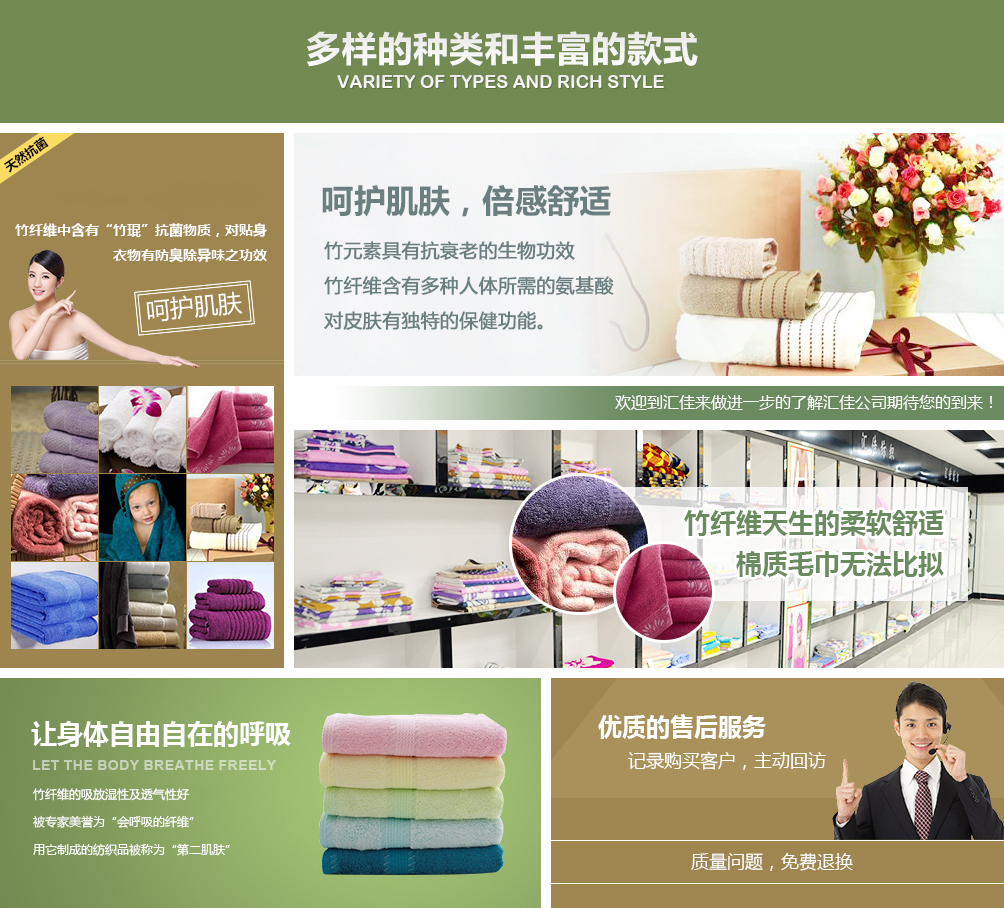 竹纖維毛巾比傳統(tǒng)的棉質(zhì)毛巾更加健康,不僅環(huán)保,還具有很好的抗菌功效。竹纖維毛巾由于其材質(zhì)因素,具有非...